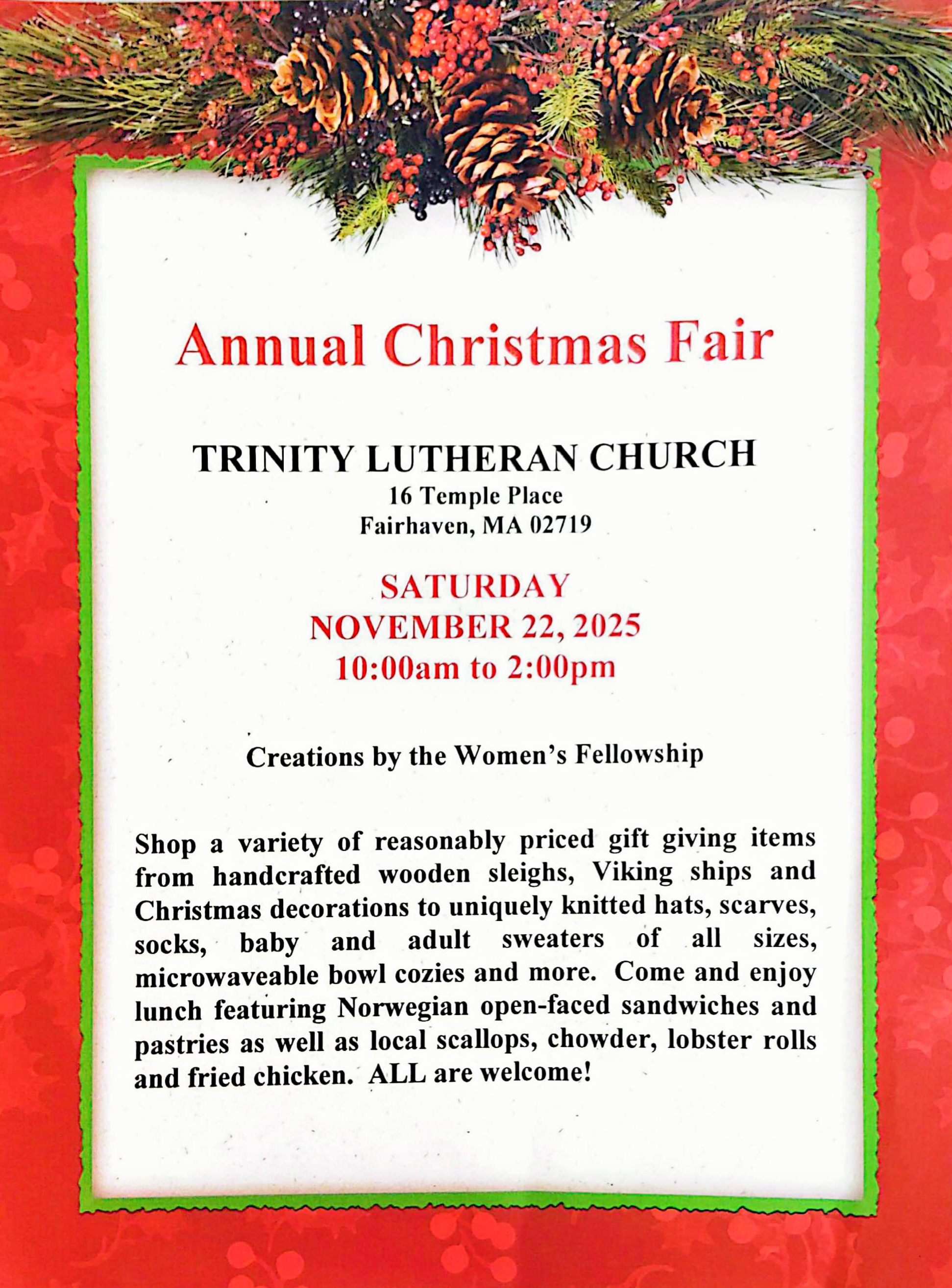 TLC’s CHRISTMAS FAIR will be coming our way on Saturday, November 23rd from 10:00am to 2:00pm.